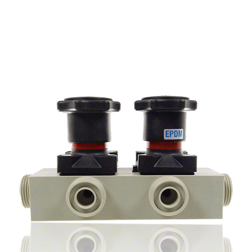 Mehrwegeventil aus PP mit zwei Handantrieben, Abgang reduziert, Membrane EPDM